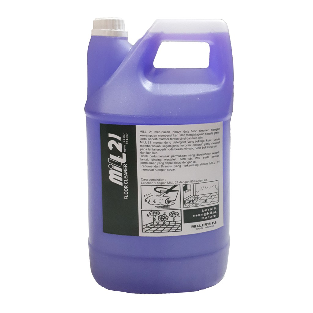 MILL 21 Floor cleaner tersedia dalam 2 ukuran yakni: 4 liter dan 28 liter dengan aroma Apple, Lemon dan Lavender. MILL 21 merupakan heavy floor cleaner dengan kemampuan membersihkan dan mengkilap segala jenis latai seperti marmer teraso vinyl dll. MILL 21 mengandung detergent yang berkerja kuat, untuk membersihkan segala kenis kotoran-kotoran yang melekat pada lantai seperti noda bekas minyak, noda bekas tanah dll.Tidak perlu meerusak permukaan yang dibersihkan seperti lantai, dinding, wastafel, bath tub, WC serta semua permukaan yang dapat dicuci dengan air. Parfum dari prancis yang terkandung dalam MILL 21 membuat ruang s