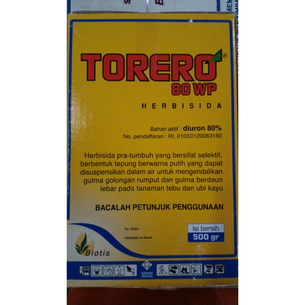 TORERO 80 WP adalah herbisida sistemik pra dan purna tumbuh dengan bahan aktif diuron, berbentuk tepung yang dapat disuspensikan, berwarna putih sampai krem, untuk mengendalikan gulma berdaun lebar dan gulma berdaun sempit pada pertanaman tebu dan ubi kayu.